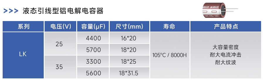 其中LK系列以下规格已在市场中批量应用于替代国际品牌,如Nichion的UPW、UPM等系列产品、NIPPON CHEMI-CON的LBY、LBG等系列产品。