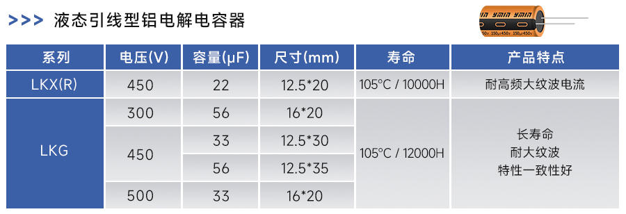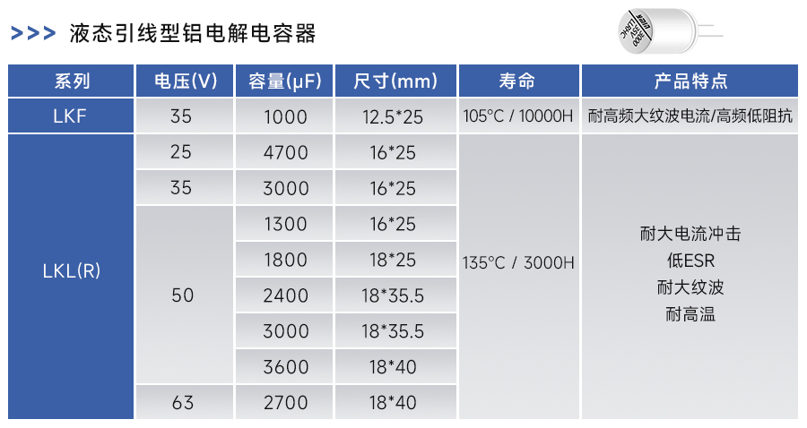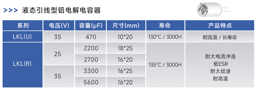 其中LKL(R)系列以下规格已在市场中大批量应用于替代国际品牌,如Nichion的UBM、UXY、UBY等系列产品、NIPPON CHEMI-CON的GPD、GVD等系列产品。